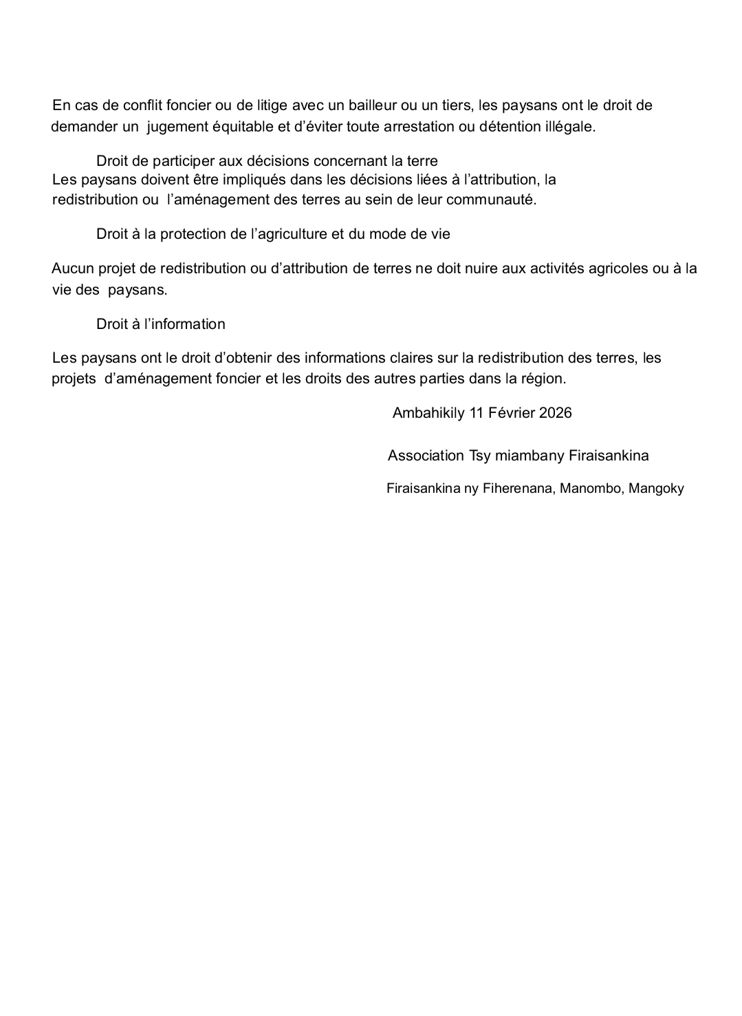 Voici Nos droits des paysans cultivateurs tels qu’ils sont reconnus par les normes internationales et la législation malgache sur la terre et les droits humains :