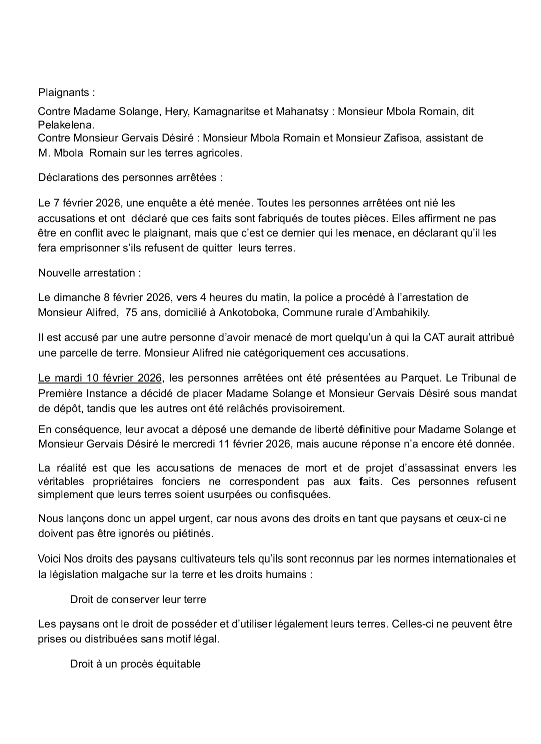 Le 7 février 2026, une enquête a été menée. Toutes les personnes arrêtées ont nié les accusations et ont déclaré que ces faits sont fabriqués de toutes pièces. Elles affirment ne pas être en conflit avec le plaignant, mais que c’est ce dernier qui les menace, en déclarant qu’il les fera emprisonner s’ils refusent de quitter leurs terres.