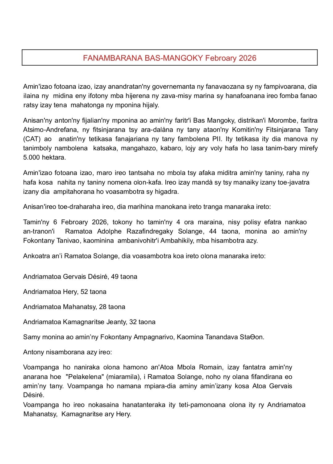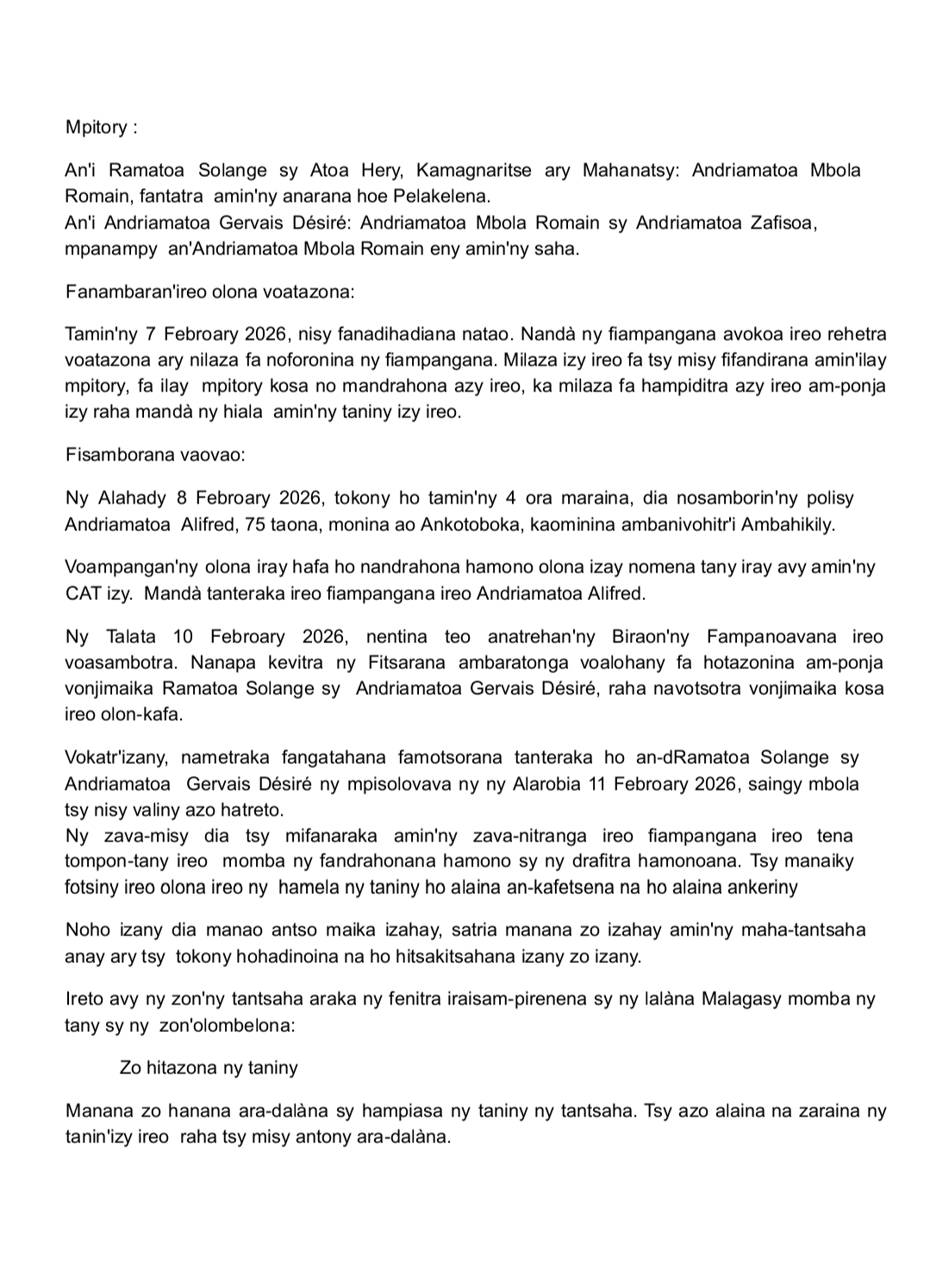 Tamin’ny 6 Febroary 2026, tokony ho tamin’ny 4 ora maraina, nisy polisy efatra nankao an-tranon’i Ramatoa Adolphe Razafindregaky Solange, 44 taona, monina ao amin’ny Fokontany Tanivao, kaominina ambanivohitr’i Ambahikily, mba hisambotra azy.